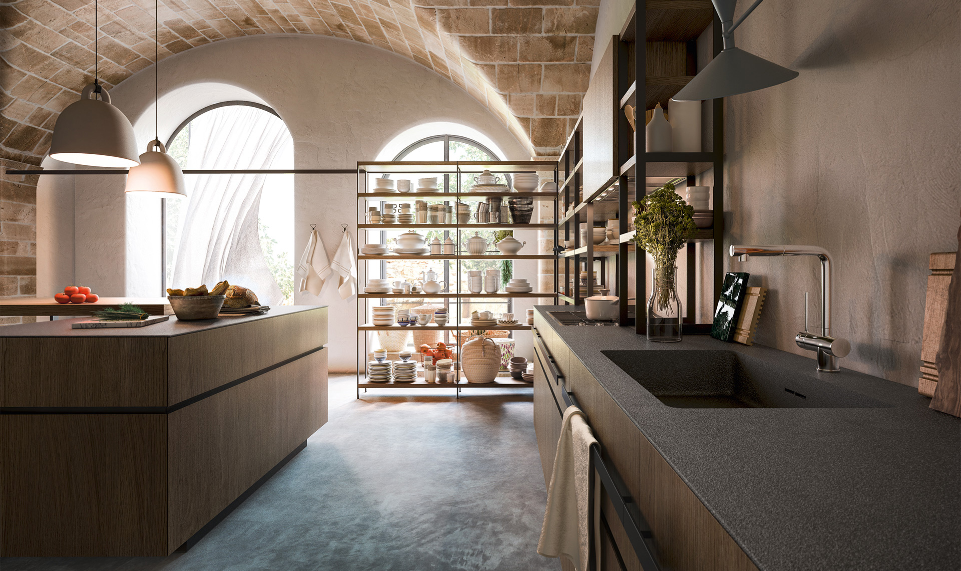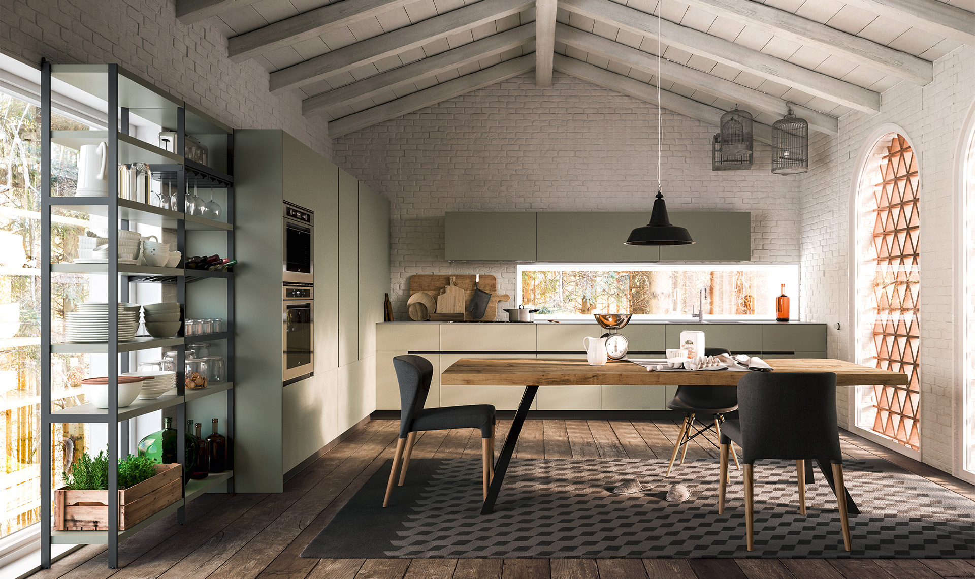 Composizione a “L” in finitura laccato opaco Tè Verde. Il piano della cucina è in pietra del cardoso fiammata spazzolata. La cucina è impreziosita da tre pensili centrati sopra le basi e da una dispensa scaffale con una struttura in color ghisa e dai ripiani laccato opaco Tè Verde. A centro stanza è presente un tavolo Board con il piano in Rovere antico.