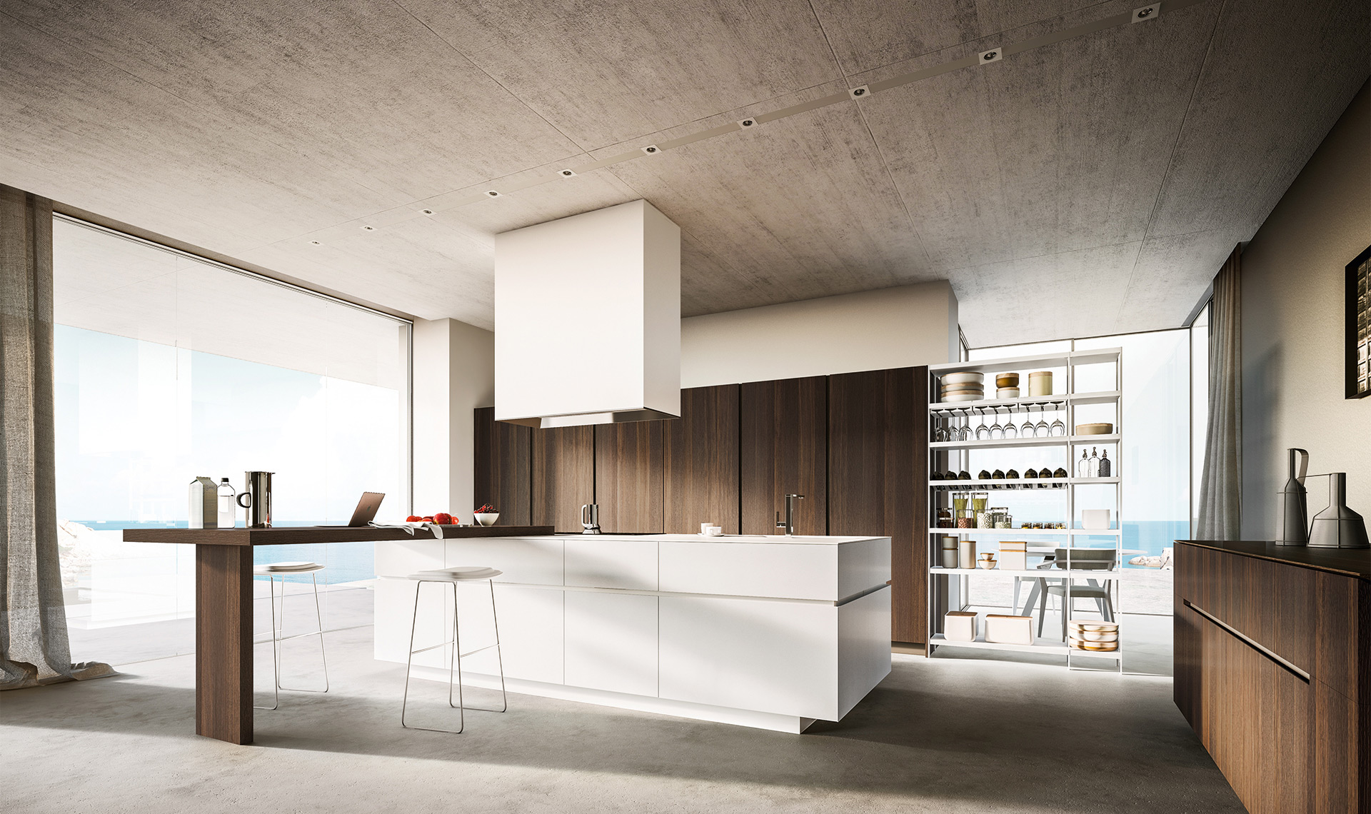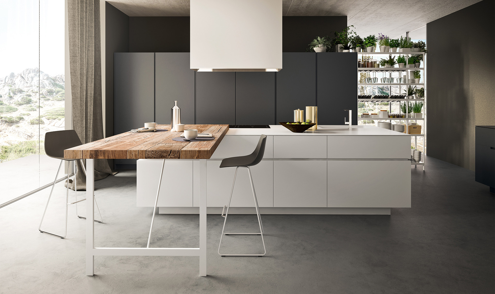 Cucina con isola in finitura laccato Bianco opaco su cui è appoggiato uno tavolo/snack in olmo Antico. Il top è in Corian bianco opaco. Le colonne sono in finitura laccato opaco Piombo. la composizione è arricchita da una dispensa scaffale in metallo verniciato bianco.